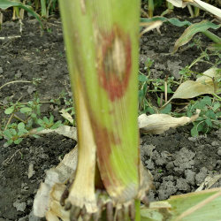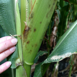 As you inspect the plants, you will see brown and pinkish-brown lesions on both the stems and the leaves. If you peel back the leaves around the ears you will see the lesions very clearly on the inside. The plants tend to die from the top down, so the corn stalks will be dead and dry on top and the death will work its way down to the base. Since it is a vascular disease, it prevents the movement of nutrients, so the ears don't have a chance to develop properly, leaving unfilled tips and/or undersized ears.
