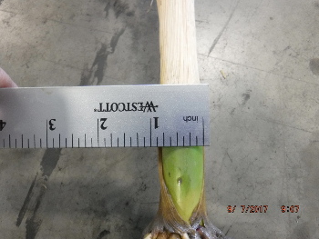 Below are some pictures of comparable stalks from just before harvest. The treated stalk on the left is thicker and greener than the untreated stalk.