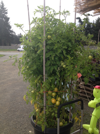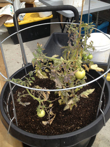 His first example is a discarded tomato plant. This young plant was ready for the dumpster when Len decided to save it. He put it into a pot, using bio-char as the potting soil, and he watered it regularly with our microbial mineral tea. The seedling was rescued in July, and by mid-October it was man-high, thick, healthy, and loaded with tomatoes.