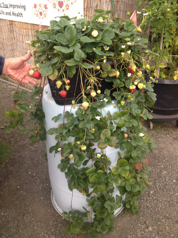 He has also been using the microbial mineral tea on some strawberries. His initial efforts created a very impressive 4' hanging strawberry garden that produced beautiful and delicious berries.His next efforts were more ambitious. These giant strawberry platforms shown on the right have runners that are over 7 feet long!